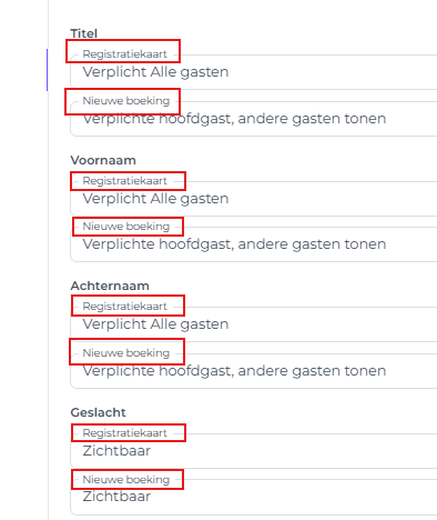 In elk veld vind je twee opties: 'Registratiekaart' (online incheckformulier) en 'Nieuwe boeking', waarmee je kunt bepalen wat systeem gebruikers moeten invullen bij het maken van een nieuwe boeking in het systeem.
