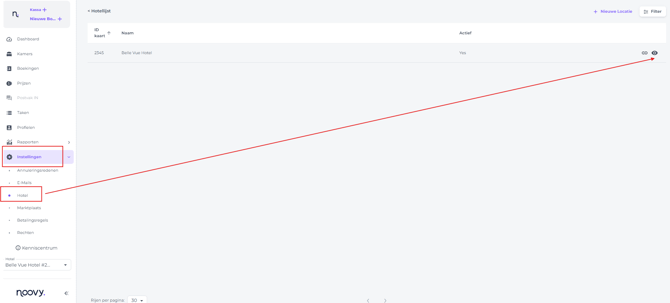 - Via het hoofdmenu ga naar Instellingen>Hotel en klik op het ogpictogram: