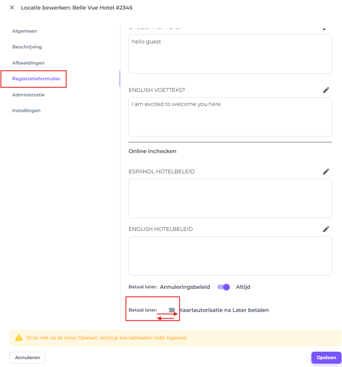 Indien gewenst kan je de optie 'Betaal Later' toevoegen via het tabblad Registratieformulier ( gasten hoeven de reservering dan niet direct te betalen):