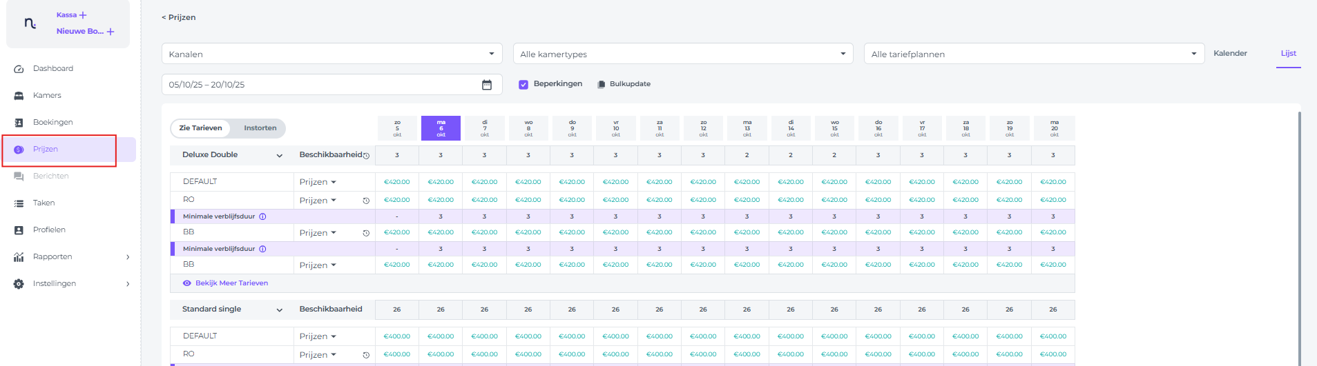 Let op: Indien je de restricties wenst in te stellen, gebruik je nooit het Default Tariefplan. In tegenstelling tot het veranderen van prijzen en beschikbaarheid in Default, heeft het aanpassen van restricties in Default geen invloed op andere tariefplannen!) Zorg er daarom voor dat je de tariefplannen selecteert welke je wenst aan te passen met een restrictie.
