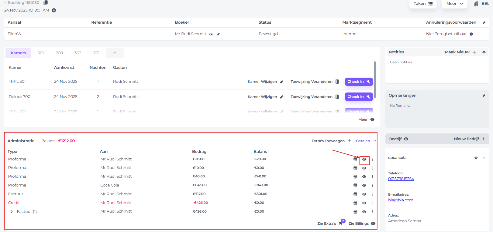 • Zoek in de Administratie sectie van de reservering de Factuur/Proforma die moet worden verzonden en klik op het oogsymbool om het betreffende document te openen: