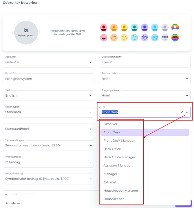 Standaardrollen kunnen niet worden bewerkt; dit zijn vaste rollen die door Noovy zijn aangemaakt.