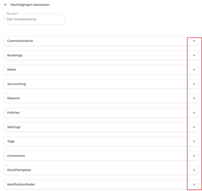 - Als je op de pijl naar beneden in een van de categorieën klikt, krijg je alle rechten van die specifieke categorie te zien. Schakel de gewenste rechten in of uit voor die rol te wijzigen: