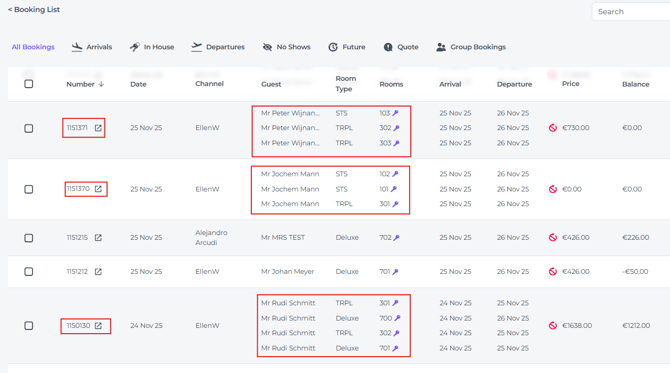 Het is eenvoudig te zien wanneer men met een boeking voor meerdere kamers te maken heeft in de Boekingslijst.