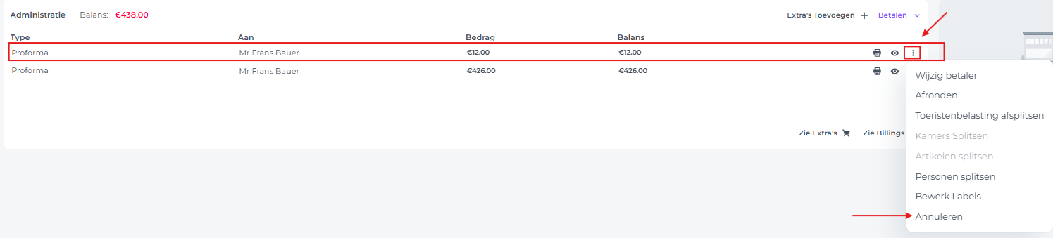 Klik op de 'Meer Acties' knop (de drie puntjes) achter de betreffende Proforma en kies Annuleren in het uitrolmenu: