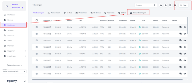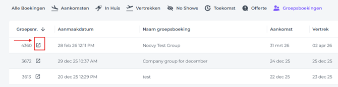 Ga in het hoofdmenu naar Boekingen - Groepsboekingen en selecteer de betreffende groepsboeking waarvoor je een proforma wilt maken. Gebruik eventueel de filter om de groepsboeking makkelijker te vinden: