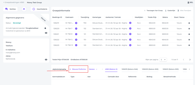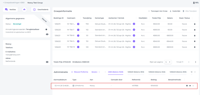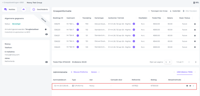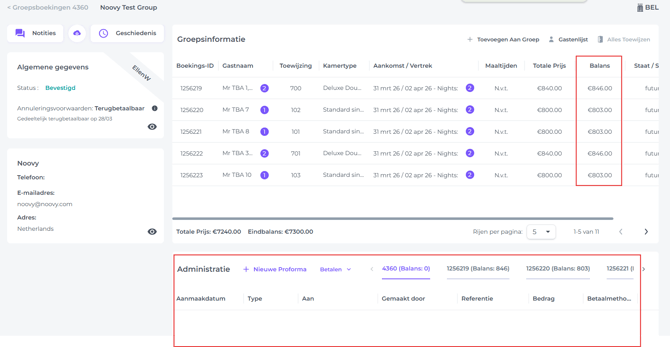 Klik op OPSLAAN: De groepsproforma wordt aangemaakt. Je zult daarna zien dat het balans van de individuele reserveringen op '0' staat