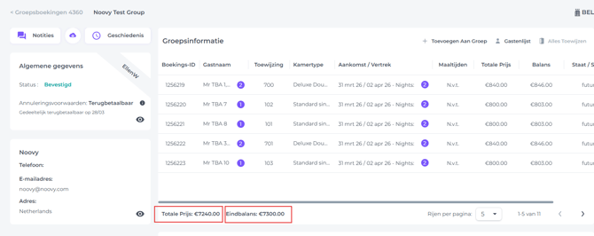De totale prijs van de groepsreservering verschilt van het eindbalans (saldo), omdat de prijs alleen de basiskamerprijs weerspiegelt. Als het ontbijt niet bij de prijs is inbegrepen, wordt dit niet getoond in de prijs, wel in de eindbalans. Ook onder andere toeristenbelasting is over het algemeen niet inbegrepen in de totale prijs.