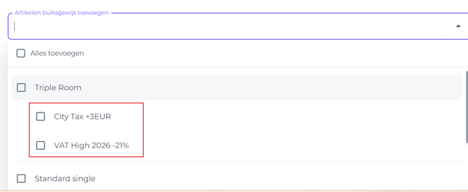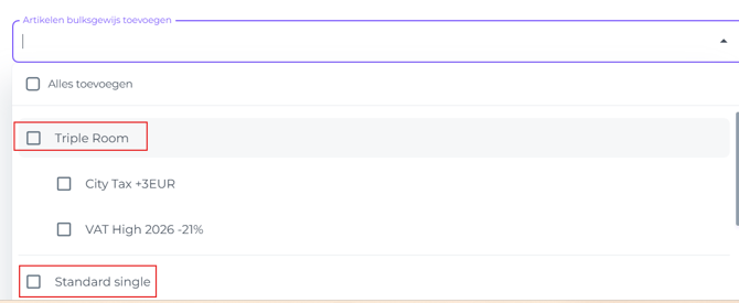 Door op het vakje 'Alles toevoegen' te klikken, voeg je alle relevante artikelen (alle kamertypes en alle bijbehorende artikelen) toe aan de proforma: