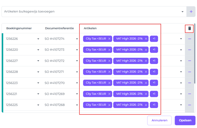 5) Artikelen bulksgewijs toevoegen Maak een proforma met meerdere reserveringen en 1 of meerdere artikelen.