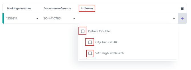 Kies vervolgens de artikelen (door de betreffende vakjes aan te vinken) die je voor deze specifieke individuele boeking op de proforma wilt hebben: