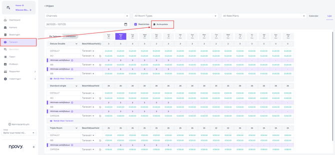 Hoewel het het meest efficiënt is om wijzigingen in beschikbaarheid en prijzen door te voeren via het standaardtariefplan (default), zodat alle gekoppelde tariefplannen automatisch worden bijgewerkt, geldt dat er GEEN restricties op het standaardtariefplan geplaatst mogen worden. Restricties die via het standaardtariefplan worden ingesteld, hebben namelijk geen effect op andere tariefplannen.