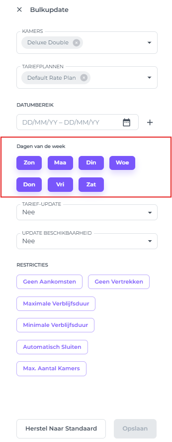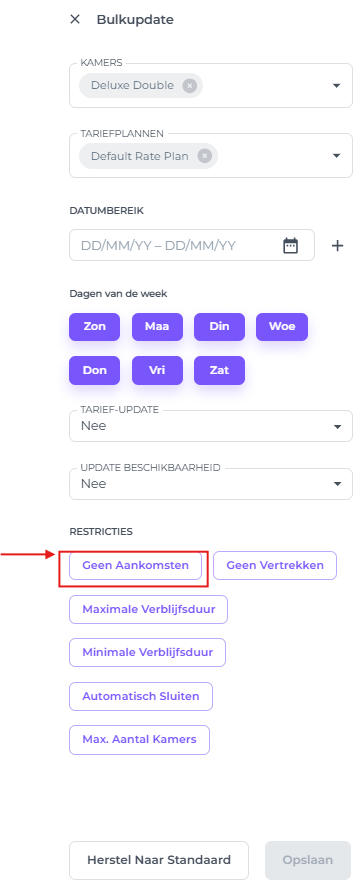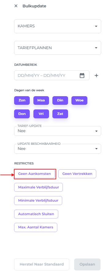 - De restricties, inclusief de  Geen Aankomsten restrictie, vind je onderaan het Bulkupdate pop-upscherm: