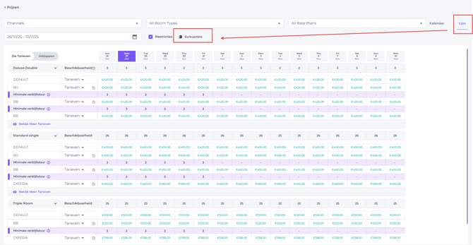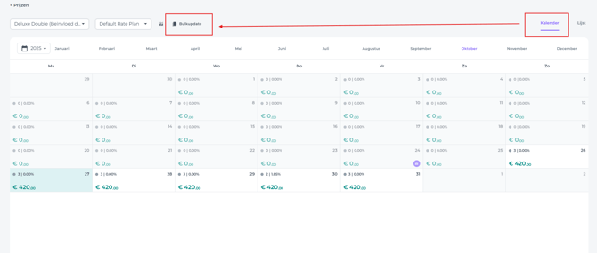 - De Bulkupdate-tool is te vinden in beide weergaven van de Tarievenkalender:
