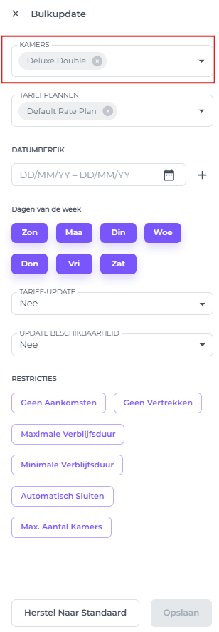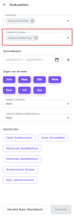 ☝️Door restricties toe te passen op alle tariefplannen behalve het standaardtariefplan, behoud je de flexibiliteit om deze beperkingen later eenvoudig ongedaan te maken door ‘Herstel naar Standaard’ te gebruiken in de bulkupdate.