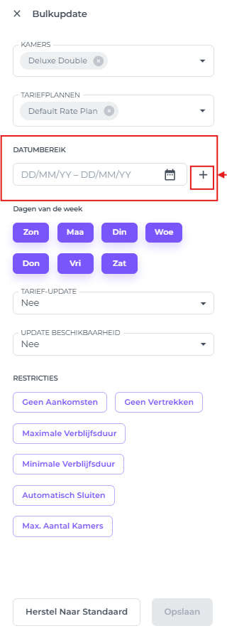 - Kies de periode waarop de 'Geen aankomsten' van toepassing moet zijn. Je kunt meerdere periodes kiezen met behulp van het + teken: