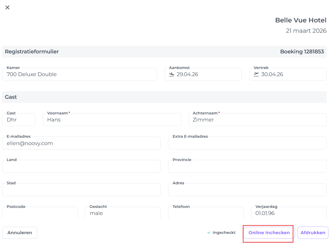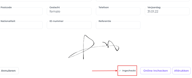 Als gasten gebruik hebben gemaakt van de tool, kan de receptionist dit zien in het registratieformulier. Wanneer de online check-in is gestart, zie je dat dit is afgevinkt: