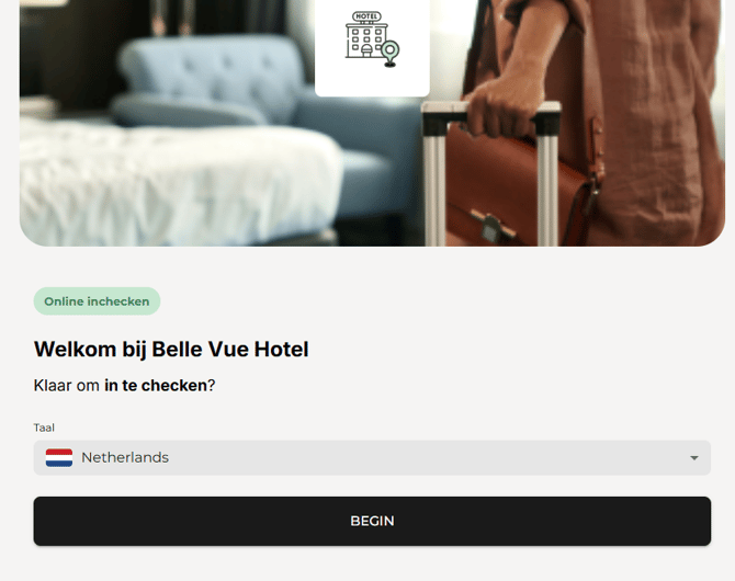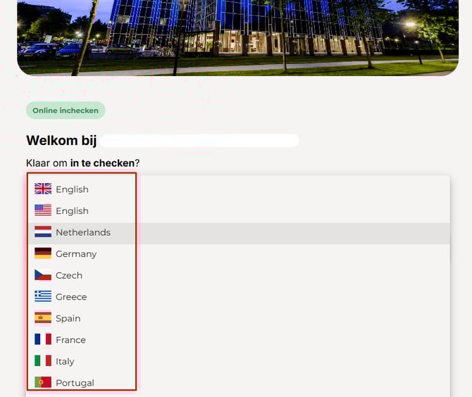 • Zodra de gast de online check-in opent, vraagt het systeem om een taalkeuze. De taal van de gast wordt automatisch geselecteerd, maar het is altijd mogelijk om dit aan te passen.