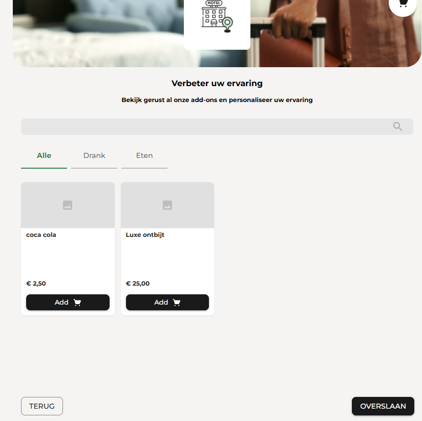 • Klikken op Opnieuw winkelen brengt de gast terug naar de Extra's-pagina. Hier kunnen ze beschikbare items bekijken en boeken, waarna ze de registratie opnieuw bevestigen.