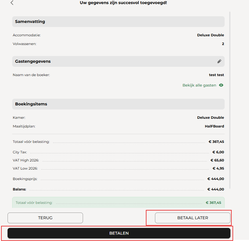 • Later betalen: Met deze optie kan de gast het incheckproces voltooien zonder direct te betalen.