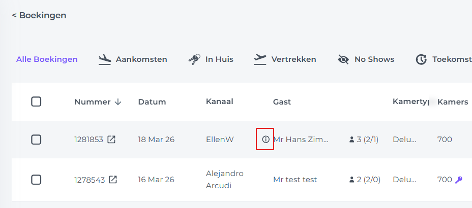 ☝️ Let op: Als de online check-in niet of niet volledig is gedaan (er ontbreekt nog informatie), trekt het systeem je aandacht met een informatie-icoon. Dit teken zie je zowel in de Boekingslijst:
