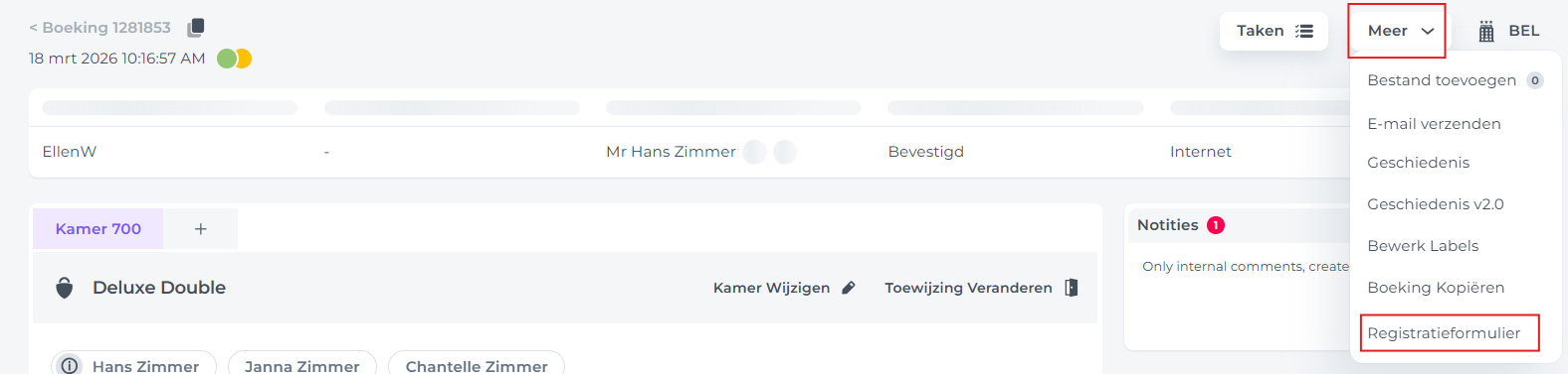 Print eerst het registratieformulier uit en laat de gast dit handmatig invullen en ondertekenen. Je kunt het systeem later bijwerken door naar de boekingspagina te gaan, te kiezen voor Meer > Registratieformulier en de knop Check-In Service te gebruiken om de gegevens van het papieren formulier over te nemen.