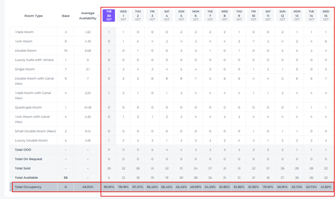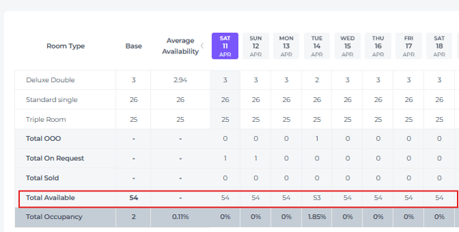 Please note that the figures in this report reflect the actual number of available rooms per day at your property. The availability shown here always displays the real-time count of rooms physically available. Even if availability is adjusted manually in the Rates Calendar of the system.