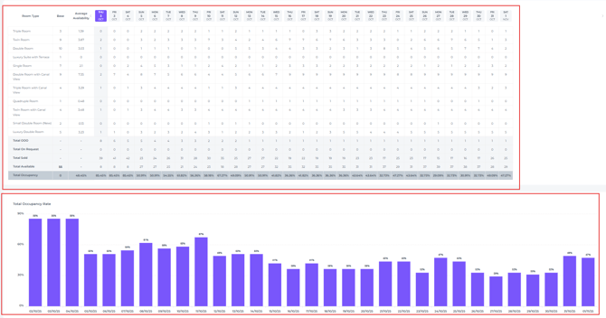 The report shows you the actual Availability (rooms left to sell) and the actual Occupancy per day (Rooms sold) in a graph for clearer visualisation: