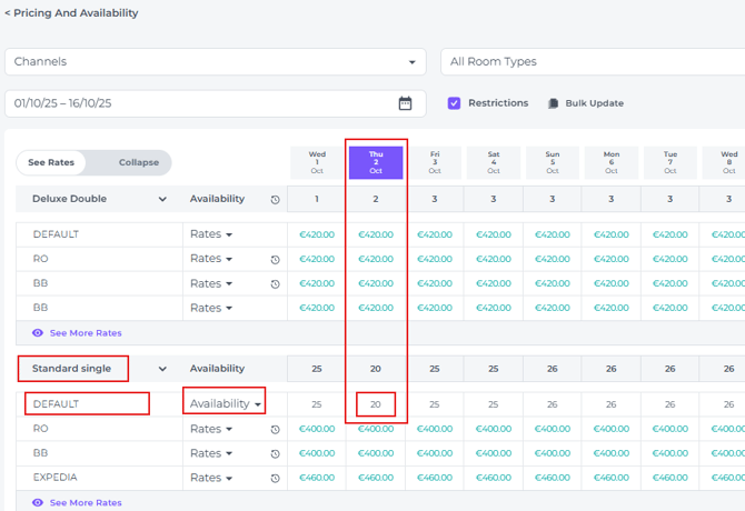 On this date, October 2nd, the availability for the single room was set on 20 in the Rates Feature of the system: