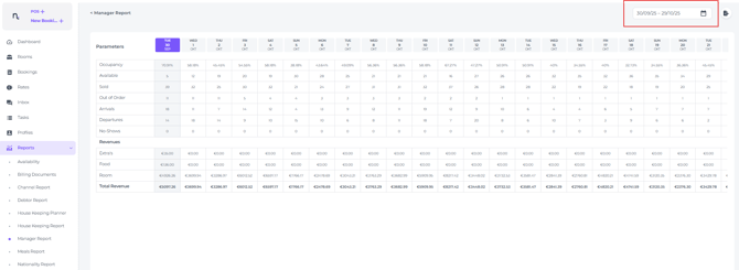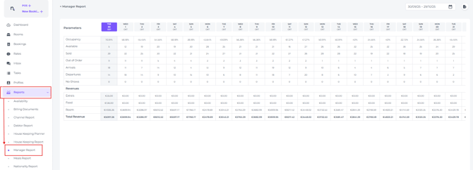 The Manager’s Report is a comprehensive operational document that summarises key parameters, including daily occupancy percentages, available and sold rooms, and reservation statuses (arrivals, departures, and no-shows), as well as any rooms set to Out of Order.