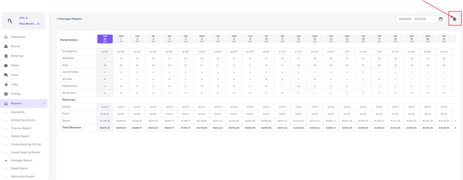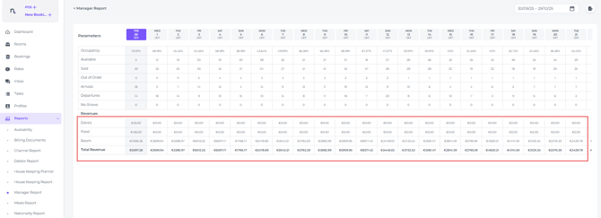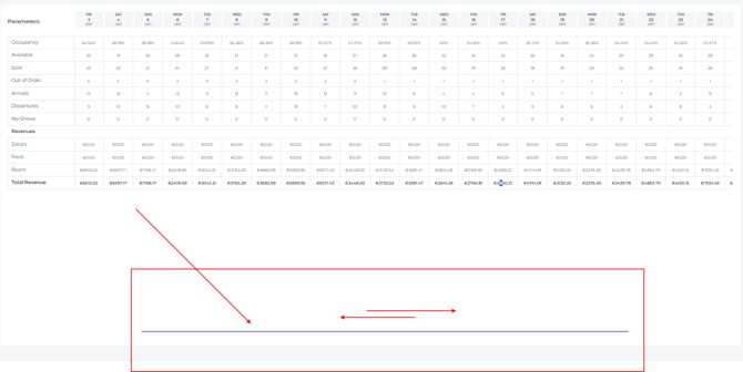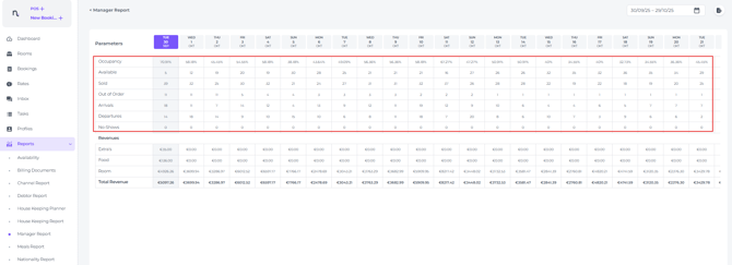 While the report displays various itemtype revenue per date (Extra's, Food and Rooms), we recommend using the Revenue Report for in depth revenue or the On Books Report for more granular insights into metrics such as RevPAR and ADR.
